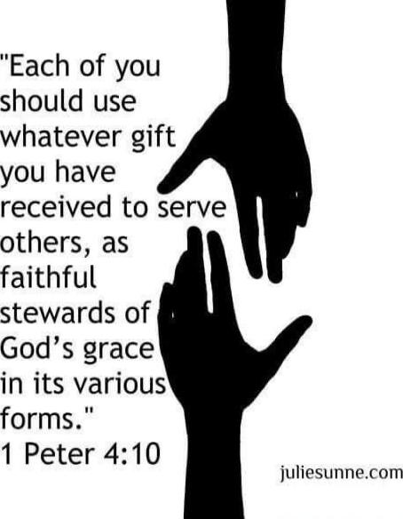 "Each of you should use whatever gift you have received to serve others, as faithful stewards of God’s grace in its various forms." 1 Peter 4:10