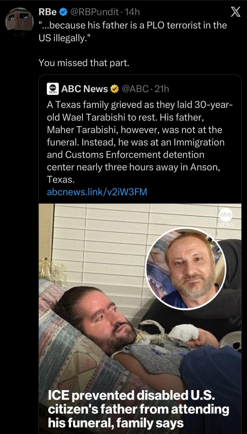 "...because his father is a PLO terrorist in the US illegally." You missed that part. A Texas family grieved as they laid 30-year-old Wael Tarabishi to rest. His father, Maher Tarabishi, however, was not at the funeral. Instead, he was at an Immigration and Customs Enforcement detention center nearly three hours away in Anson, Texas. abcsnews.link