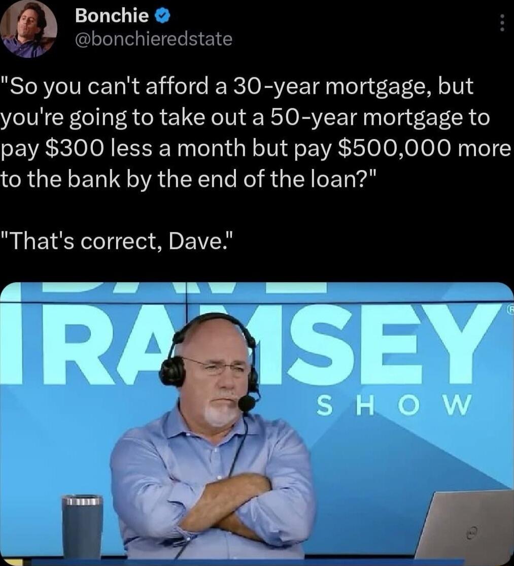 "So you can't afford a 30-year mortgage, but you're going to take out a 50-year mortgage to pay $300 less a month but pay $500,000 more to the bank by the end of the loan?" "That's correct, Dave."