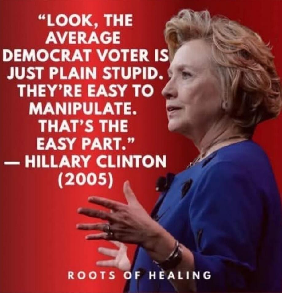 "LOOK, THE AVERAGE DEMOCRAT VOTER IS JUST PLAIN STUPID. THEY'RE EASY TO MANIPULATE. THAT'S THE EASY PART." — HILLARY CLINTON (2005)