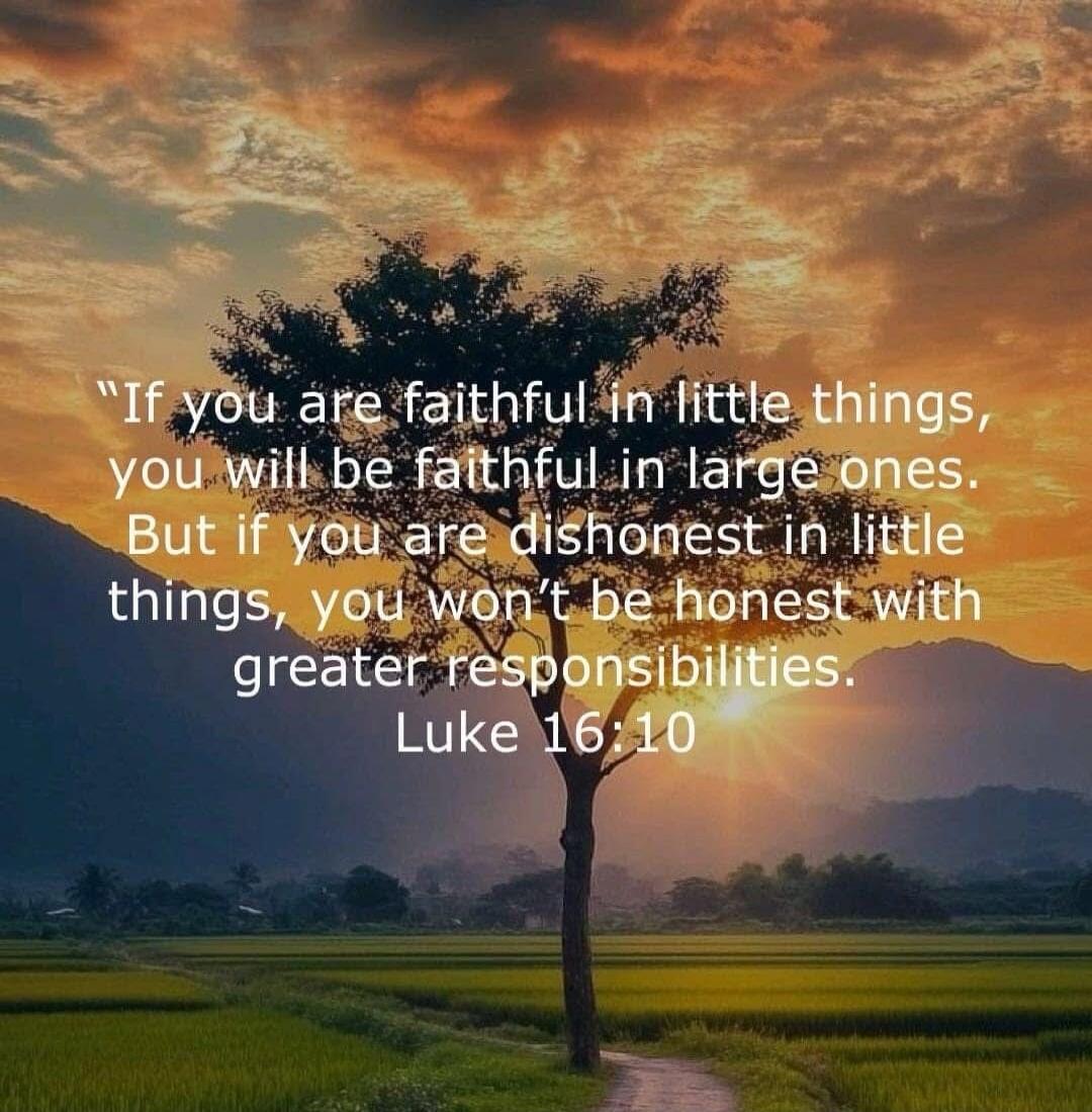 "If you are faithful in little things, you will be faithful in large ones. But if you are dishonest in little things, you won’t be honest with greater responsibilities. Luke 16:10"