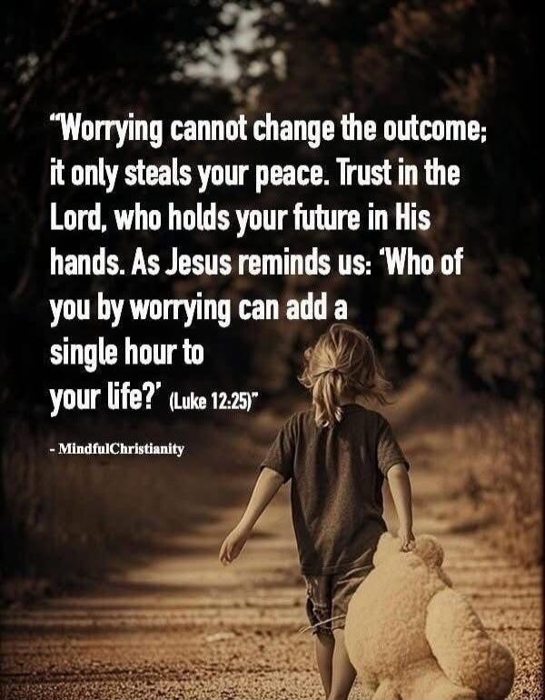 "Worrying cannot change the outcome; it only steals your peace. Trust in the Lord, who holds your future in His hands. As Jesus reminds us: 'Who of you by worrying can add a single hour to your life?' (Luke 12:25)" - MindfulChristianity