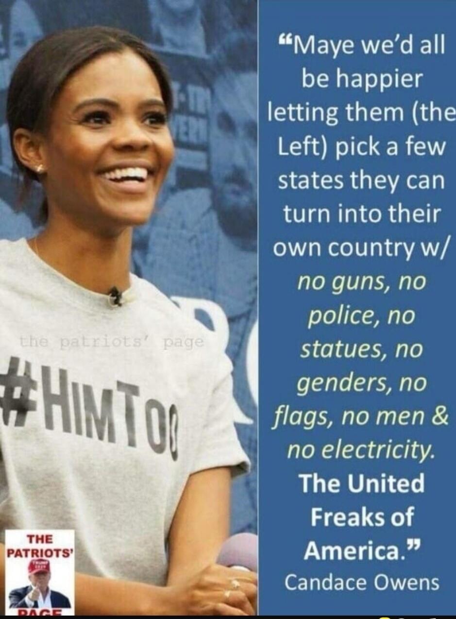 "#HIMTOO" The shirt text and the quote on the right: "Maybe we'd all be happier letting them (the Left) pick a few states they can turn into their own country w/ no guns, no police, no statues, no genders, no flags, no men & no electricity. The United Freaks of America."
