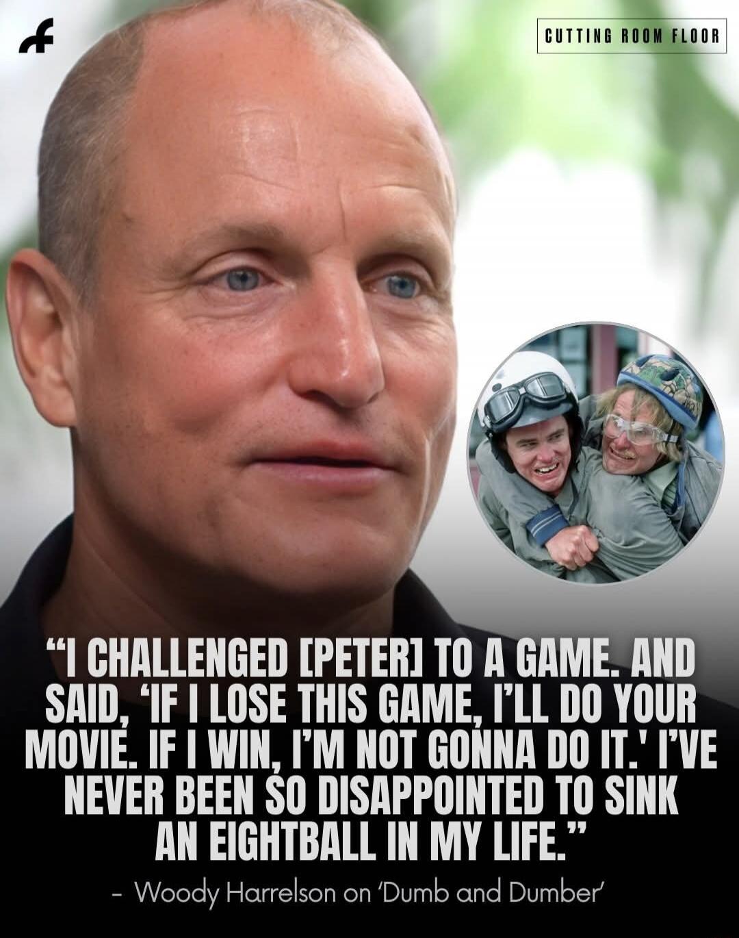 "I CHALLENGED [PETER] TO A GAME. AND SAID, 'IF I LOSE THIS GAME, I’LL DO YOUR MOVIE. IF I WIN, I’M NOT GONNA DO IT.' I’VE NEVER BEEN SO DISAPPOINTED TO SINK AN EIGHTBALL IN MY LIFE." - Woody Harrelson on Dumb and Dumber