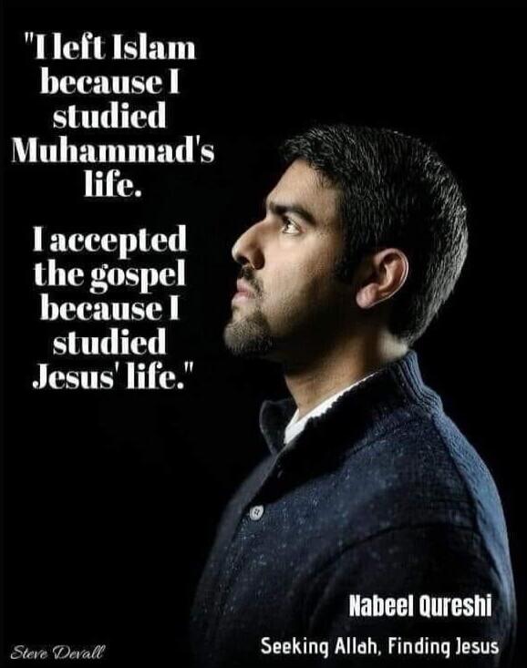 "I left Islam because I studied Muhammad's life. I accepted the gospel because I studied Jesus' life." Nabeel Qureshi Seeking Allah, Finding Jesus