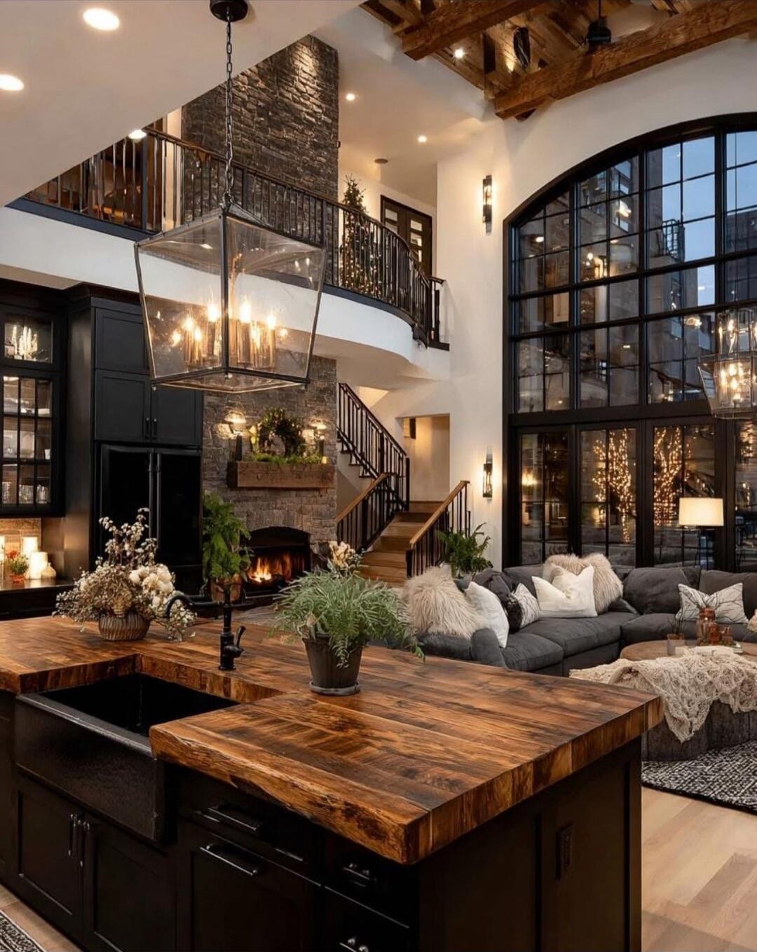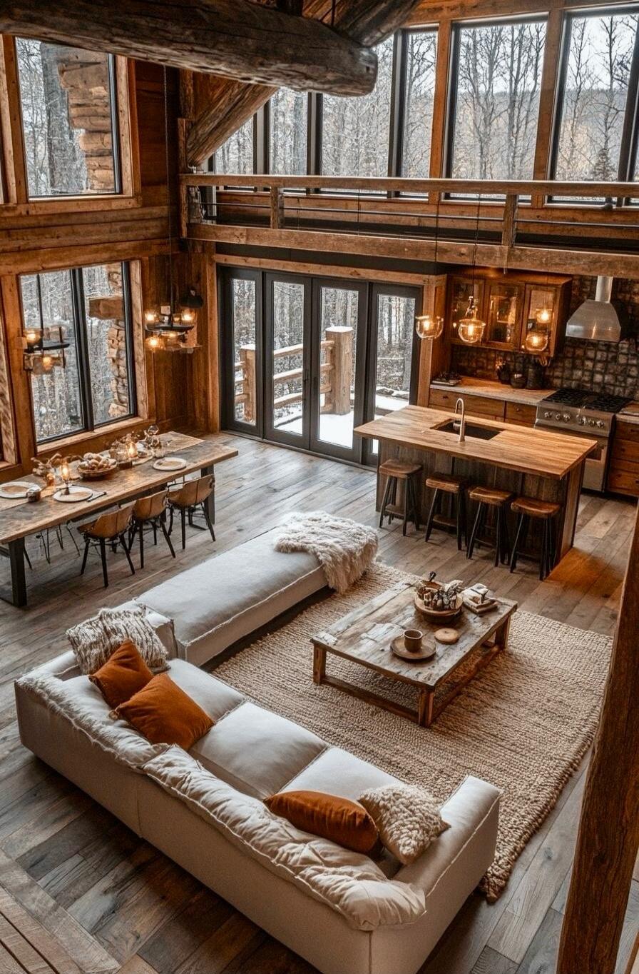 A rustic cabin kitchen. Left side features a black wood stove with a tall chimney pipe. Green lower cabinets line the back wall beneath a wooden countertop with a sink. Open wooden shelves hold jars, mugs, and kitchenware. A stainless steel oven/range sits against the back wall. Warm, wide plank wood floors run through the room with exposed beams i