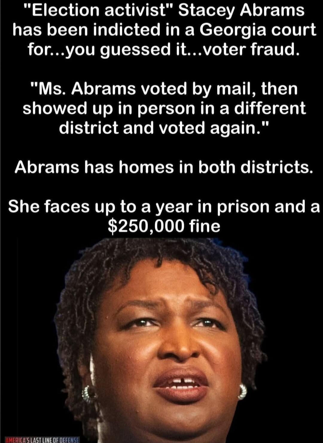 "Election activist" Stacey Abrams has been indicted in a Georgia court for...you guessed it...voter fraud. "Ms. Abrams voted by mail, then showed up in person in a different district and voted again." Abrams has homes in both districts. She faces up to a year in prison and a $250,000 fine. AMERICA'S LAST LINE OF DEFENSE.